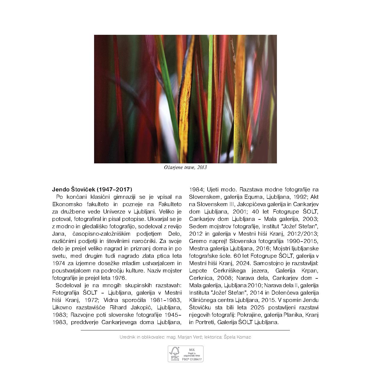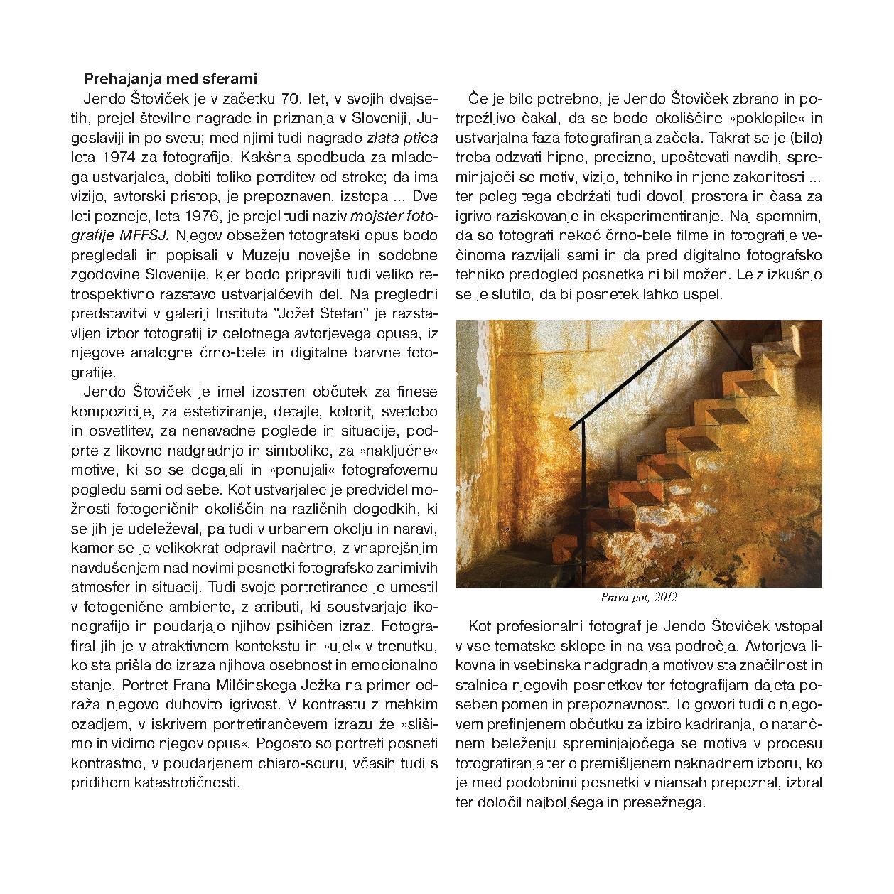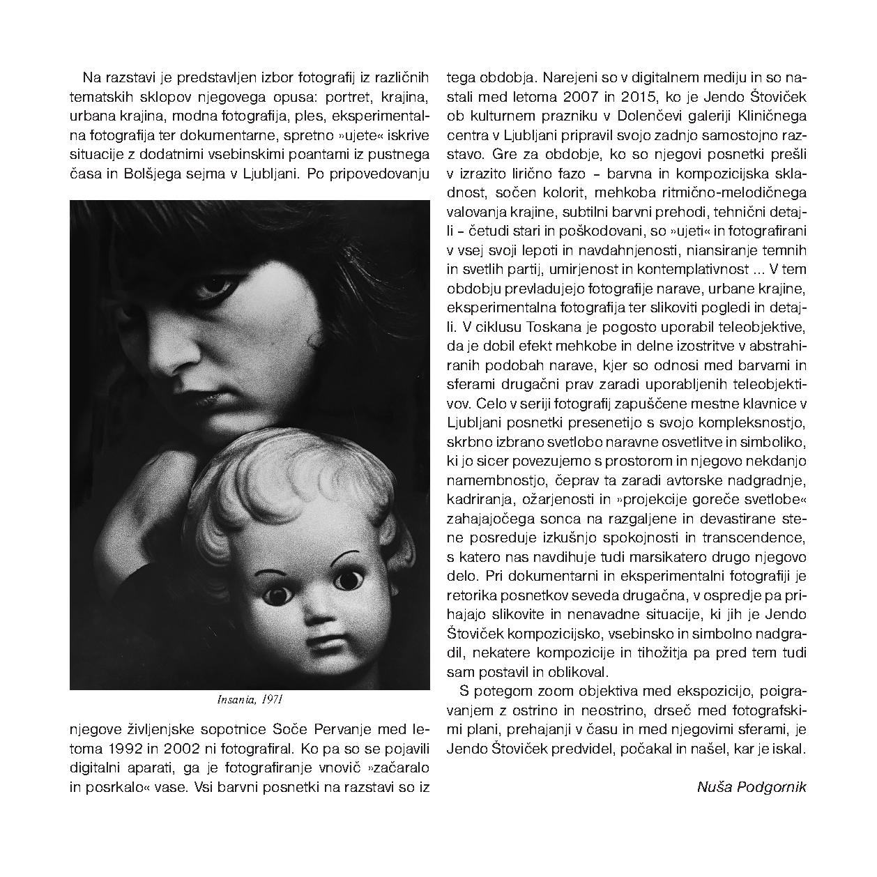 Pri dokumentarni in eksperimentalni fotografiji prihajajo v ospredje slikovite in nenavadne situacije, ki jih je Jendo Štoviček kompozicijsko, vsebinsko in simbolno nadgradil, nekatere kompozicije in tihožitja pa pred tem tudi sam oblikoval. S potegom zoom objektiva med ekspozicijo, poigravanjem z ostrino in neostrino, drseč med fotografskimi plani, prehajanji v času in med njegovimi sferami, je Jendo Štoviček predvidel, počakal in našel, kar je iskal.